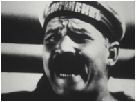 Tout à coup, Marker opère une coupe qui transcende les nations, les époques et jusqu’aux genres cinématographiques. Il transporte le spectateur des rues de Prague à un gros plan du marin Vakoulintchouk, héros du film d’Eisenstein Bronenosets Potyomkin (Le cuirassé Potemkine, 1925) engagé dans une harangue passionnée, dont le contenu est révélé par une autre coupe qui fait apparaître l’un des plus célèbres cartons du cinéma muet en cyrillique sur l’écran : le mot «Bratie! » (« Frères! »). Soudain, Marker coupe de nouveau. Retour à la scène originelle : le soldat russe, lointain descendant de Vakoulintchouk fixe la caméra braquée sur son visage plongé dans la perplexité par la phase historique qu’il vient juste de traverser (images 1 – 4).