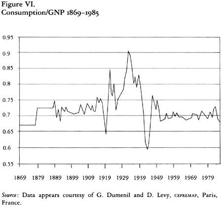 En réalité, après avoir stagné pendant la dépression des années 1870, les salaires réels ont progressé d’environ 75 % entre 1880 et 191436. Il est vrai que dans la période immédiatement antérieure à la Première guerre mondiale, une forte immigration a impliqué une croissance des salaires réels légèrement inférieure à la croissance de la productivité du travail, même si cela ne correspond pas à une stagnation des salaires réels. Rees conclut qu’entre 1889 et 1913, les salaires horaires dans la production ont augmenté en moyenne de 1,3 % par an, alors que la production par heure de travail a augmenté en moyenne de 2,1 % par an (il est intéressant de rappeler, au passage, que la croissance moyenne par unité de facteur de production, travail et capital combinés, a également augmenté de 1,3 % par an en moyenne pendant cette période37). De plus, sur l’ensemble de la période 1880-1914, alors que le salaire réel augmentait de 75 %, l’indice de la productivité du travail dans l’industrie augmentait à peine plus rapidement, de 83 %38. Si l’on fait débuter la période à la fin de la guerre civile, il est probable que la part des salaires dans le produit total a effectivement augmenté39. Des données fiables sur la part de la consommation (et pas de l’investissement) dans le PNB ne sont disponibles qu’à partir de 1890, mais jusqu’au déclenchement de la Première guerre mondiale il a conservé un niveau équivalent ou supérieur à toute période après 1950 (voir Schéma VI infra).