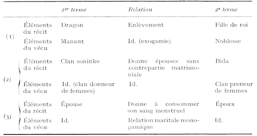 Si les récits se polarisent autour des rapports sociaux, ils tendent aussi à *s’*organiser autour d’eux. C’est au travers d’eux que les personnages et les objets sont associés ou dissociés. L’examen des relations décrites par le récit permet d’identifier les termes de ces rapports, même lorsque ces termes sont représentés par des symboles. Lorsque, à l’inverse, la relation est symbolisée, l’identification de ses termes permet de qualifier cette relation, car il y a rarement symbolisme à la fois des termes et des relations. Ainsi, lorsque le mythe dit qu’une femme donne à manger à son mari des feuilles souillées de son sang menstruel (Lévi-Strauss 1964 : 108), les termes du rapport (époux et épouse) indiquent la relation maritale : vouloir donner à manger une nourriture imprégnée de sang menstruel, c’est vouloir faire accepter les relations maritales sexuelles même en période de menstrues – revendiquer la monogamie ou contester la polygamie. À l’inverse, si un dragon enlève la fille du roi, l’enlèvement indique une violation de l’interdit de mariage, donc une différence sociale entre le roi (la noblesse) et le dragon, lequel n’ayant pas normalement accès aux femmes nobles, symbolise la classe des manants, des serfs.