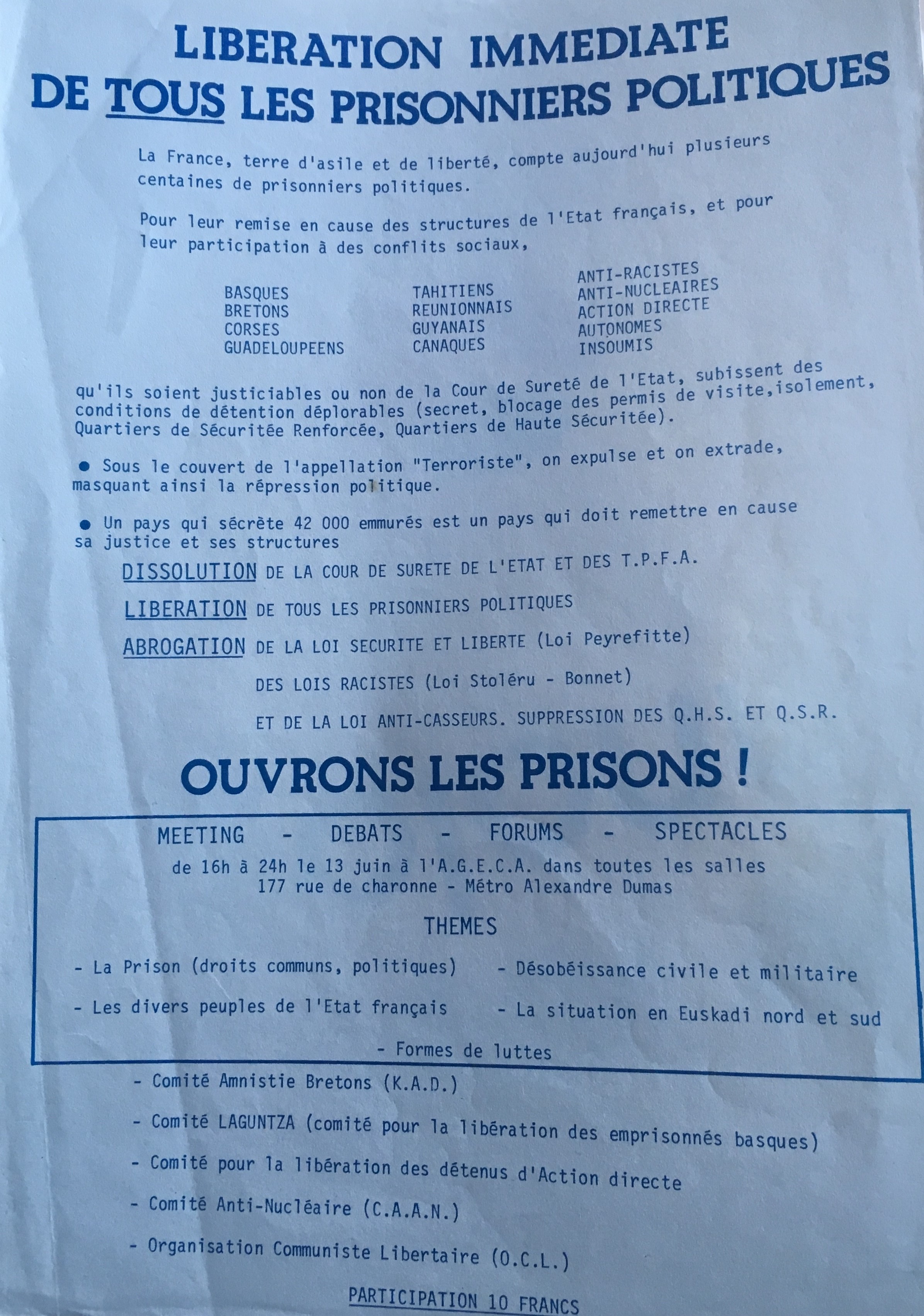 Cet appel formulé par Camarades et consistant à additionner toutes les forces se concrétise peu de temps après par la formation d’Action Directe et la réalisation de son premier attentat le 1 mai 1979. Une transition très bien décrite dans un ouvrage11 qui met en évidence la confluence de nombreux vecteurs permettant à un groupe comme AD d’apparaitre sur la scène politique française à la fin des années 1970. L’organisation va commettre quelques attentats mais plusieurs de ses membres se font rapidement interpeller. Arrive alors l’élection de François Mitterrand en 1981 et l’espoir d’une amnistie généreuse. À l’intérieur comme à l’extérieur des prisons une mobilisation débute en vue d’obtenir la libération de tous les militants politiques.