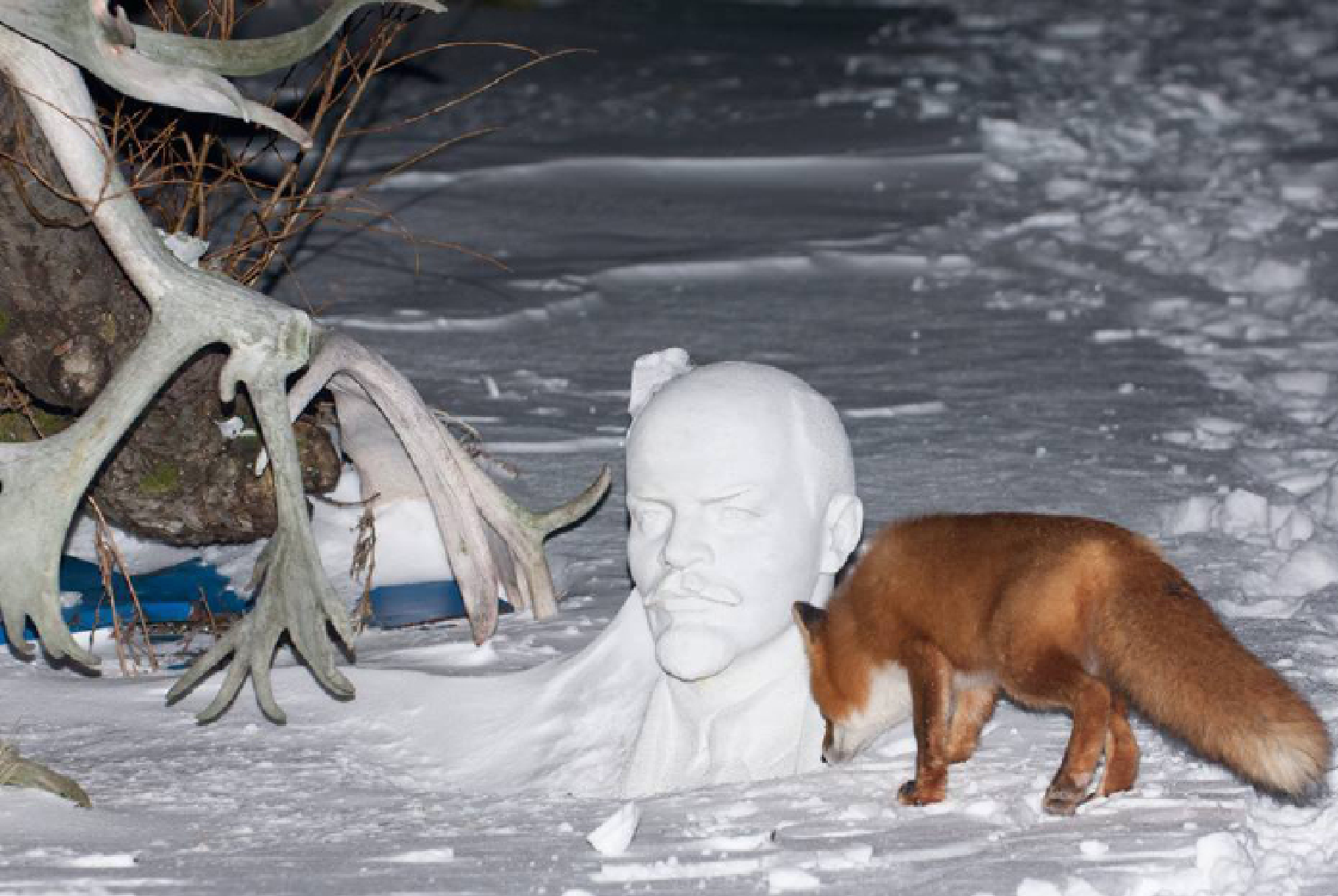 L’affiche de cette soirée montre également un renard s’approchant du buste de Lénine et je ne peux pas m’empêcher de vous répéter une histoire. À l’automne 1918, Lénine partit chasser avec un camarade, qui a décrit plus tard ce qui arriva lorsque les deux hommes firent la rencontre d’un renard : « Le renard fila droit sur Lénine, qui ne l’avait pas vu car l’animal était recouvert de la neige tombée des épicéas. Lorsqu’il aperçut le renard, Lénine resta pétrifié, (…) le fixa longuement du regard et ne tira pas (…). Le renard resta planté là encore un moment avant de repartir comme la foudre. “Pourquoi est-ce tu n’as pas tiré ?“ demandais-je, “Et bien… il était tellement beau et adorable.“ » répondit Lénine. C’est peut-être l’héritier de ce renard qui vient rendre hommage à ce buste dans la neige, et en porter le deuil : parce qu’à ce stade de l’histoire, il n’y a pas de climat plus menacé d’extinction que la neige et l’air pur et glacial.