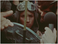 Mais revenons au Fond de l’air est rouge. Alors que la séquence d’ouverture se poursuit, Marker opère une coupe qui fait apparaître des mains faisant le signe de la paix sur fond de ciel bleu. L’image est dorénavant en couleur et la scène est à l’évidence beaucoup plus proche de l’époque du film. Sur la bande son, les souvenirs de Signoret laissent place à un enregistrement de la composition de Luciano Berio « Musica notturna nelle strade di Madrid. » Démarre alors une séquence de trois minutes régulièrement entrecoupées de scènes de manifestation ou de révoltes politiques extraites du film d’Eisenstein ou d’images contemporaines tournées à Cuba, au Mexique, en France, en Italie, au Japon ou ailleurs. Les résonances entre ces deux types d’image abondent : des personnes en deuil participent à une procession funéraire publique et essuient les larmes qui coulent sur leurs visages, des orateurs haranguent la foule, des femmes interpellent des officiers de police, des manifestants déterminés brandissent leurs poings serrés en signe de défi. L’affinité entre ces images est visuellement accentuée par le fait que les scènes documentaires tournées en 16mm sont traitées avec un film monochromatique teinté, ce qui leur confère une ressemblance frappante avec la bobine dont sont extraits les passages de Potemkine.
